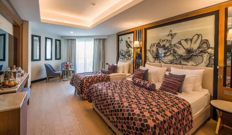 Fantástico hotel ubicado en Adalya, a pie de playa. Si lo que buscas son unas vacaciones paradisíacas, donde relajarte y disfrutar con tus amigos o familia, este es tu hotel ideal. Todas las habitaciones son muy amplias, luminosas y confortables. Están decoradas con colores alegres y disponen de múltiples servicios, entre los que se encuentran televisión, teléfono, aire acondicionado, baño privado y minibar. El hotel ofrece a sus huéspedes un fantástico spa con los últimos tratamientos corporales donde podrás relajarte mientras te cuidan. Además, cuenta con una gran piscina exterior y acceso directo a la playa.