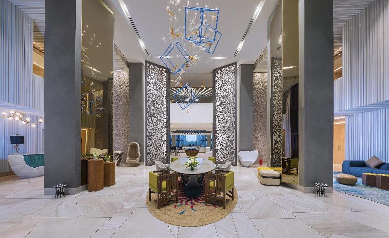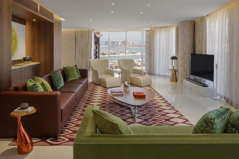 El Andaz Dubai The Palm está situado en el tronco de Palm Jumeirah, a 30 minutos en coche tanto del Aeropuerto Internacional de Dubái como del Aeropuerto Internacional Al Maktoum. Ubicado justo enfrente del Nakheel Mall, con 300 metros de playa, el hotel ofrece 216 habitaciones, incluidas 34 suites, la mayoría con vistas al mar, y 116 residencias con servicios. Las opciones de alojamiento incluyen estudios completamente amueblados, apartamentos de una y dos habitaciones. El hotel también cuenta con 590 metros cuadrados de espacio para eventos, incluyendo cuatro estudios y áreas de reuniones interiores/exteriores. Te esperan cinco opciones gastronómicas: The Locale, The Andaz Lounge, Hanami (un restaurante japonés en el piso 15), Knox (un bar clandestino) y La Coco (un restaurante y bar junto a la playa). El servicio de habitaciones está disponible las 24 horas.