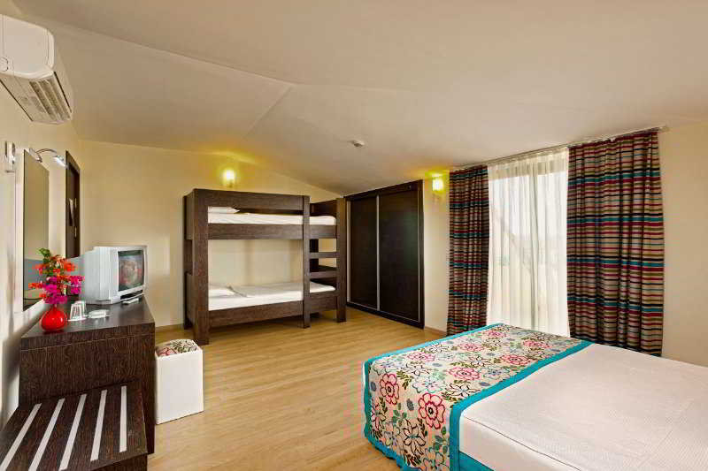 Este moderno hotel está situado en Side Kumköy, a unos dos kilómetros de la antigua ciudad de Side y a unos tres kilómetros del centro. La preciosa playa (a 650 metros) está separada del hotel solamente por una calle. En los alrededores del hotel hay varias zonas comerciales con bares, tiendas, boutiques, discotecas y restaurantes. A poca distancia también está la zona turística, un precioso parque y un bonito bosque.||Este acogedor hotel, inaugurado en el año 2001, está climatizado y dispone de un total de 122 habitaciones repartidas en tres plantas. Está ubicado en una calle principal y cuenta con un hall de entrada con ascensores y un área de recepción abierta las 24 horas del día, donde se le ofrece servicio de caja fuerte y de cambio de divisa. Dispone también de una sala de televisión y de juegos, un pequeño mercado, algunas tiendas, un salón de peluquería, una discoteca, un bar y un restaurante a la carta y con sillas altas para los niños. Aquellos que viajen por motivos de negocios podrán usar la sala de conferencias. Como prestaciones adicionales están, abonando cargo adicional, el servicio de lavandería y de atención médica. El hotel le ofrece también servicio de préstamo de bicicletas, así como un aparcamiento, un club infantil y un parque para los niños.||Las modernas habitaciones disponen de sistema de aire acondicionado (por horas), baño alicatado con bañera, ducha y secador de pelo. Están equipadas con teléfono de línea directa, televisión vía satélite o por cable, radio, minibar, cama doble, moqueta, caja fuerte de alquiler, calefacción central y balcón o terraza.
