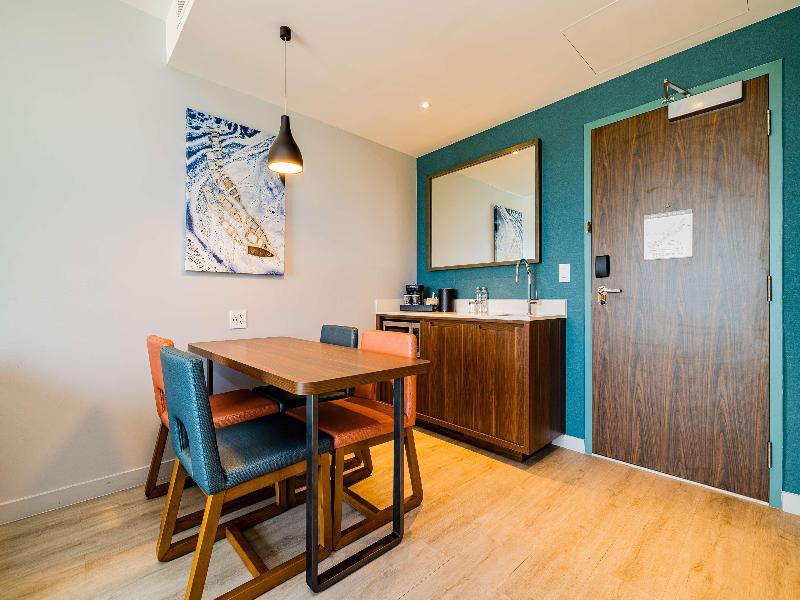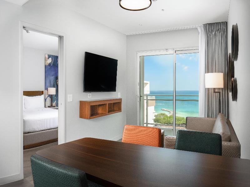 El cargo diario del resort incluye: acceso a internet para huéspedes; actividades diarias en el resort y para niños; clases de fitness diarias; toallas de playa; alquiler de bicicletas; dos botellas de agua diarias. Ubicado entre las impresionantes aguas caribeñas y el tranquilo Santuario de Aves Bubali, el Embassy Suites by Hilton Aruba Resort te invita a experimentar la Isla Feliz de Aruba de una manera única. Relájate en Eagle Beach, una de las mejores playas del mundo, explora las vibrantes tiendas y restaurantes en las cercanías de Palm Beach y Oranjestad, y descubre las ricas atracciones naturales y culturales de la isla. Perfectas para estancias prolongadas, nuestras 330 espaciosas suites ofrecen dos dormitorios, sala de estar y comedor independientes, un bar con fregadero, microondas y mini nevera. Comienza tu día con un desayuno a la carta gratuito y disfruta de un paseo por nuestro colorido túnel adornado con grafitis que conduce a una playa apartada con sillas de playa y palapas para nuestros huéspedes. Al final del día, únete a nosotros en el lobby para nuestra Recepción Nocturna donde puedes disfrutar de bebidas y refrigerios gratuitos.