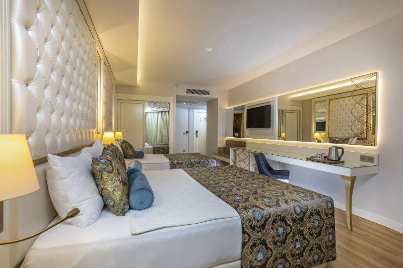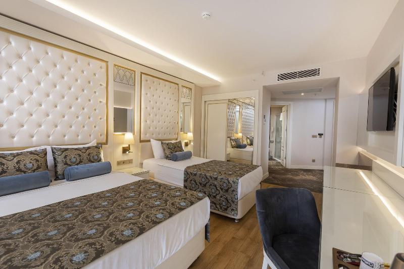 Con una hermosa vista al jardín de naranjos, nuestro complejo de 592 habitaciones se encuentra en Alanya, donde el mar y el río se unen en una maravilla de la naturaleza. Te ofrece una experiencia vacacional diferente con su concepto de servicio orientado a la satisfacción del huésped. Nuestro Palace, que ofrece servicio Ultra-Todo-Incluido durante 24 horas, consta de un edificio principal de 7 plantas, construido en un área de 37. 000 m². Haydarpasha Palace te ofrece comodidad, entretenimiento, recreación y actividades en la famosa región de Türkler - Konaklı bajo el magnífico sol del Mediterráneo. Haydarpasha Palace se encuentra a 20 km de Alanya, la perla del Mediterráneo, a 5 km del centro de la ciudad (Avsallar, Konaklı); a 90 km del Aeropuerto de Antalya y a 60 km del Aeropuerto de Gazipaşa/Alanya. En Haydarpasha Palace, se ofrecen a nuestros huéspedes delicias preparadas con esmero dentro del servicio Ultra-Todo-Incluido durante 24 horas. Nuestro servicio de comida y bebida, que continúa durante todo el día, está disponible para los huéspedes, además del Restaurante Principal La Gare, con restaurantes a la carta de 4 cocinas internacionales diferentes (Stazione Italian, Shuang Far East, White Hill Fish & Seafood, Sofra Turkish Cuisine), pastelería, 1 restaurante de playa, 6 bares y un rincón de snacks lleno de opciones. La piscina principal y la piscina cubierta, que se calienta entre el 15 de marzo y el 31 de mayo y del 1 de octubre al 15 de noviembre, ofrecen una gran delicia acuática con el Aquapark de playa, Wet Bubble, Aquapark infantil y Piscina Infinity para familias que desean tener unas vacaciones únicas. Se puede llegar a nuestra playa privada con bandera azul a través del corto túnel dentro del complejo. Prepárate para vivir momentos extraordinarios con actividades de animación, noches de fiesta temáticas, actuaciones de música en vivo, espectáculos profesionales y entretenimientos especiales para tus hijos.