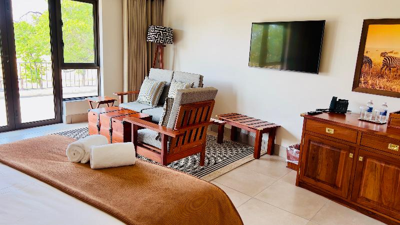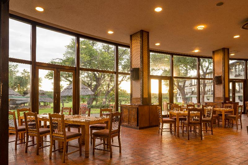 El parque ocupa 14. 650 km2 de naturaleza africana virgen y está gestionado por un servicio de parques nacionales cuyos guardabosques se encuentran entre los mejores del sector. Conocen el parque, su flora, su fauna y sus habitantes a la perfección. El hotel, uno de los favoritos de los visitantes de todo el mundo, se encuentra en el límite del parque, en sus propios extensos terrenos, que forman parte del parque y está a solo una hora en coche de las Victoria Falls. Este lodge es un oasis de lujo en el corazón de la sabana africana. Rodeado de naturaleza virgen, los huéspedes tienen acceso a todas las comodidades modernas necesarias para que su estancia sea realmente cómoda. El hotel cuenta con dos restaurantes, uno de ellos al aire libre con vistas al abrevadero. El bar es el lugar ideal para relajarse después de un largo día de safari. El lodge también ofrece instalaciones para conferencias y banquetes, una tienda de recuerdos, guías de safari, servicio de lavandería, servicio de habitaciones y aparcamiento abierto y seguro. Hay un total de 100 habitaciones disponibles. Las habitaciones están decoradas en tonos azules y marrones naturales profundos con moquetas de colores vivos. Cada habitación tiene un baño privado con bañera y ducha. Todas las habitaciones disponen de aire acondicionado con regulación individual, ventilador de techo y calefacción para que los huéspedes puedan crear el ambiente ideal. Todas las habitaciones tienen amplias ventanas con vistas a la zona de la piscina y al abrevadero, o a la sabana natural donde se puede ver algún elefante macho descansando a la sombra de los árboles. Solo algunas habitaciones tienen televisión, en respuesta a la necesidad expresa de los huéspedes de disfrutar de un entorno tranquilo en el que conectar con la naturaleza. Un secador de pelo, teléfono con línea directa y servicio de té y café también se incluyen en todas las habitaciones.