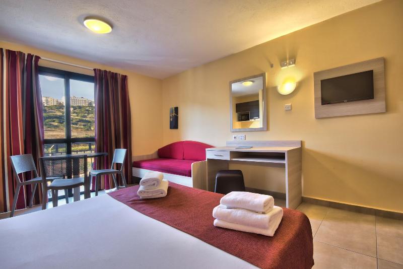 El Luna Holiday Complex es un apartahotel situado en Mellieha, a pocos minutos a pie de la playa de arena más grande de Malta, Ghadira Bay. Encontrarás varios restaurantes, bares y cafeterías convenientemente ubicados en el camino. El complejo consta de 160 apartamentos con cocina, desde estudios hasta apartamentos familiares. Todos los apartamentos cuentan con una cocina americana. Tres opciones gastronómicas en las instalaciones ofrecen comidas durante todo el día, y puedes elegir entre opciones de cocina americana, alojamiento y desayuno o media pensión. Las comodidades incluyen recepción 24/7, wifi en todo el establecimiento, una piscina en la azotea (solo para adultos, mayores de 17 años), una piscina familiar, una piscina cubierta de temporada, un centro de buceo, una tienda de comestibles, un cajero automático y un gimnasio. Los estudios estándar y los apartamentos ejecutivos superiores son ideales para parejas o familias pequeñas (máximo 3 personas), mientras que los apartamentos familiares superiores son perfectos para familias o grupos de 4-5 personas. Nuestro equipo de limpieza te proporcionará toallas limpias cada dos días y un cambio completo de ropa de cama y servicio de limpieza una vez a la semana. Los apartamentos también se limpian por completo a la salida. Nuestras opciones gastronómicas se adaptan a diversas necesidades dietéticas, incluyendo vegetariana, vegana, halal y sin gluten. Te animamos a informar a nuestro equipo sobre cualquier alergia o requisito. El check-in online está disponible a través de nuestra página web para agilizar tu proceso de llegada. Nuestro equipo está aquí para ayudarte, así que no dudes en contactarnos si tienes alguna pregunta o solicitud. Ten en cuenta: Actualmente se están llevando a cabo obras de excavación de terceros detrás del hotel.