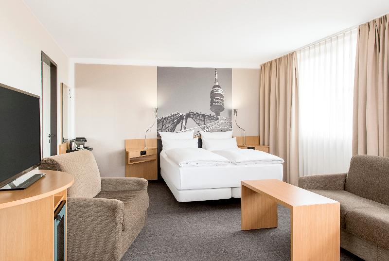 Ubicado en la zona de Zamdorf en Múnich, el hotel NH München Messe es una excelente opción para viajeros de negocios. El recinto ferial y el International Congress Center se encuentran a 15 minutos en coche y puedes llegar a las autopistas A94, A99 y A8 en cuestión de minutos. El autobús para justo afuera del hotel y te lleva al centro de Múnich en unos 20 minutos. Las 253 habitaciones del NH München Messe son espaciosas y están diseñadas para tu comodidad, ya que cada una cuenta con una carta de almohadas y wifi gratuito. Hay habitaciones conectadas disponibles para grupos y familias. Te encantará nuestro desayuno diario recién hecho, que ofrece una variedad de opciones de comida y bebida, incluyendo embutidos y especialidades locales. El almuerzo y la cena se sirven en el restaurante del hotel, donde puedes disfrutar de la cocina europea y bávara en los elegantes asientos de cuero negro. Durante los meses de verano, nuestro amable personal sirve bebidas y aperitivos en nuestra terraza-biergarten bávara. Para relajarte en una tarde fría, dirígete a nuestro bar del vestíbulo. También hay un gimnasio en el hotel, y si necesitas celebrar una reunión, disponemos de 9 salas de eventos con capacidad para hasta 195 personas.