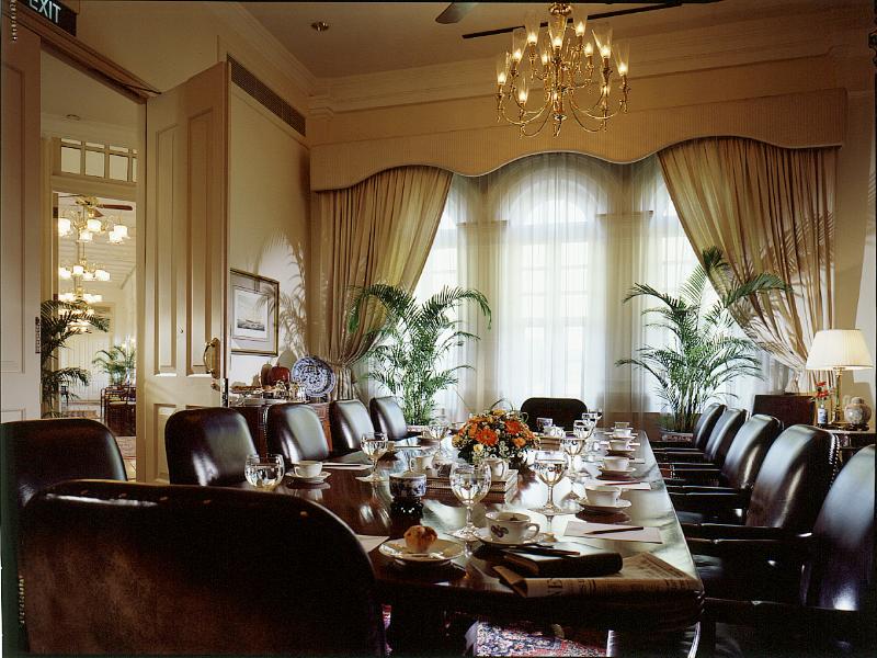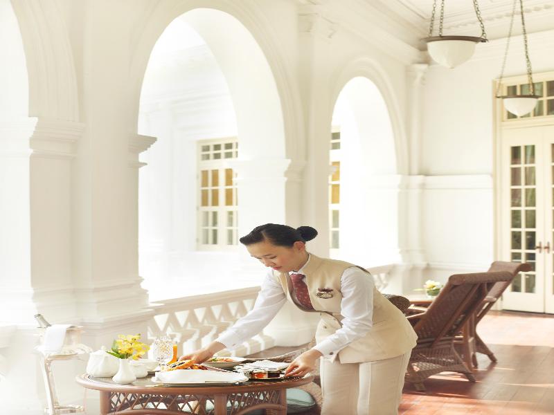 El hotel fue declarado patrimonio nacional por el Gobierno de Signapur en 1987. El edificio ha sido restaurado y cuenta con 103 suites, extensos jardines y patios, 18 restaurantes, 6 áreas funcionales interiores y exteriores, 6 tiendas diferentes, como la librería, tintorería, floristeria, minimercado, boutiques y tiendas de recuerdos y regalos. Además, ofrece museo propio, el teatro privado ‘Jubilee Hall', el spa ‘Raffles Amrita' y la escuela de cocina ‘Raffles Culinary Academy' y cuenta con 40 tiendas de especialidades regionales. Hay servicio 24 horas de conserje y de mayordomo, servicio diario de buenas noches, servicio 24 horas de habitaciones, servicio de lavandería y tintorería, centro de negocios 24 horas y, a petición, servicio de niñera.
