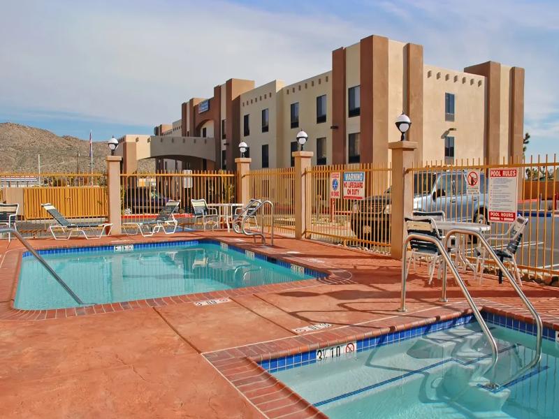 A las afueras de Joshua Tree Nuestro hotel está justo al lado de la autopista 29 Palms, en el centro de Yucca Valley. Estamos a 10 minutos de Pioneertown y a 20 minutos del Parque Nacional Joshua Tree. También estamos a unos 40 minutos de la base 29 Palms Marine Corp. Disfruta de nuestra piscina cubierta, gimnasio y café y bagels gratuitos cada mañana.