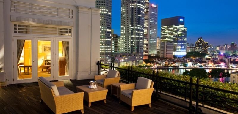 Este hotel de 400 habitaciones es una obra maestra de elegancia y confort. Se creó a partir del edificio Fullerton, construido en 1928, que sirvió de oficina general de correos de Singapur y ofrece un rico patrimonio, arquitectura neoclásica y una ubicación estratégica. Entre las instalaciones ofrecidas se incluye un centro financiero abierto las 24 horas, que proporciona servicios completos de negocios, ordenadores y conexión a Internet, salas de reuniones e información financiera y noticias internacionales de última hora. El hotel dispone también de instalaciones para banquetes y conferencias, conexión a Internet inalámbrica en la mayor parte del establecimiento, incluyendo la zona de piscina y la zona al aire libre del restaurante Town, al lado del río de Singapur. Además, hay varias instalaciones gastronómicas para elegir, aire acondicionado, vestíbulo con recepción 24 horas, caja fuerte, cambio de divisa, ascensor, aparcamiento (con sobrecargo) y servicio de habitaciones y de lavandería (con sobrecargo).